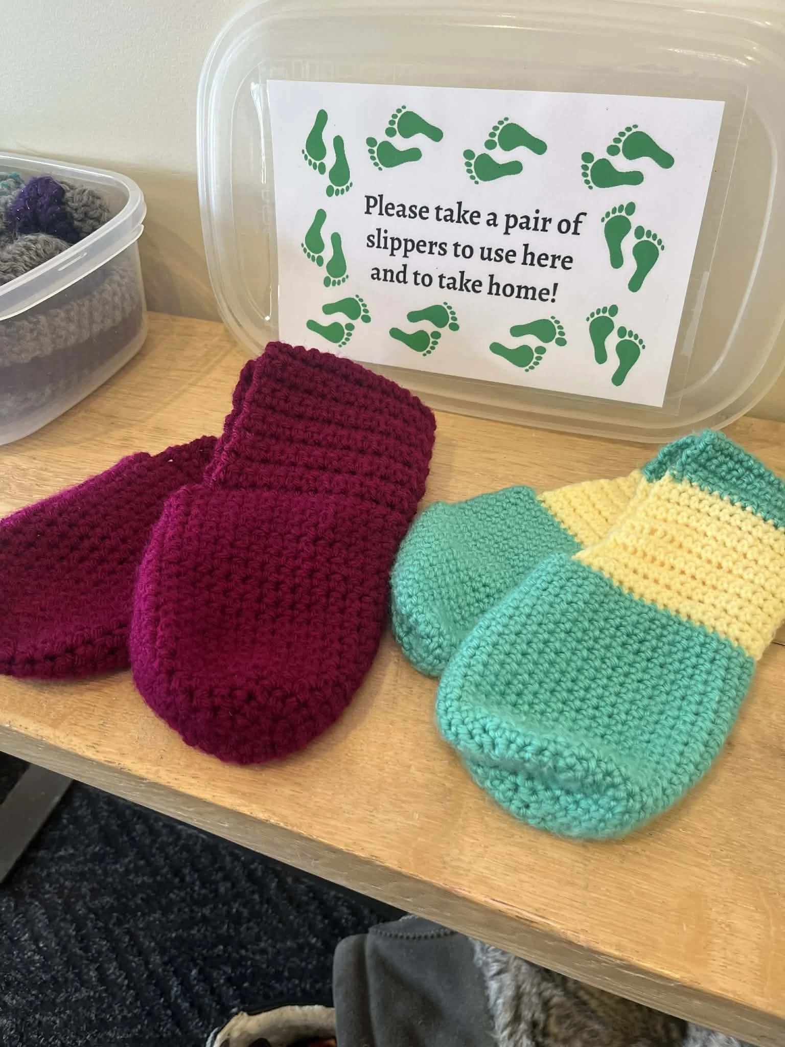 If you are a crochet or knitting artist and would like to support this program, we gratefully accept adult-sized slippers in a variety of sizes. Each pair you create brings comfort to a guest during what can often be a stressful or emotional time.